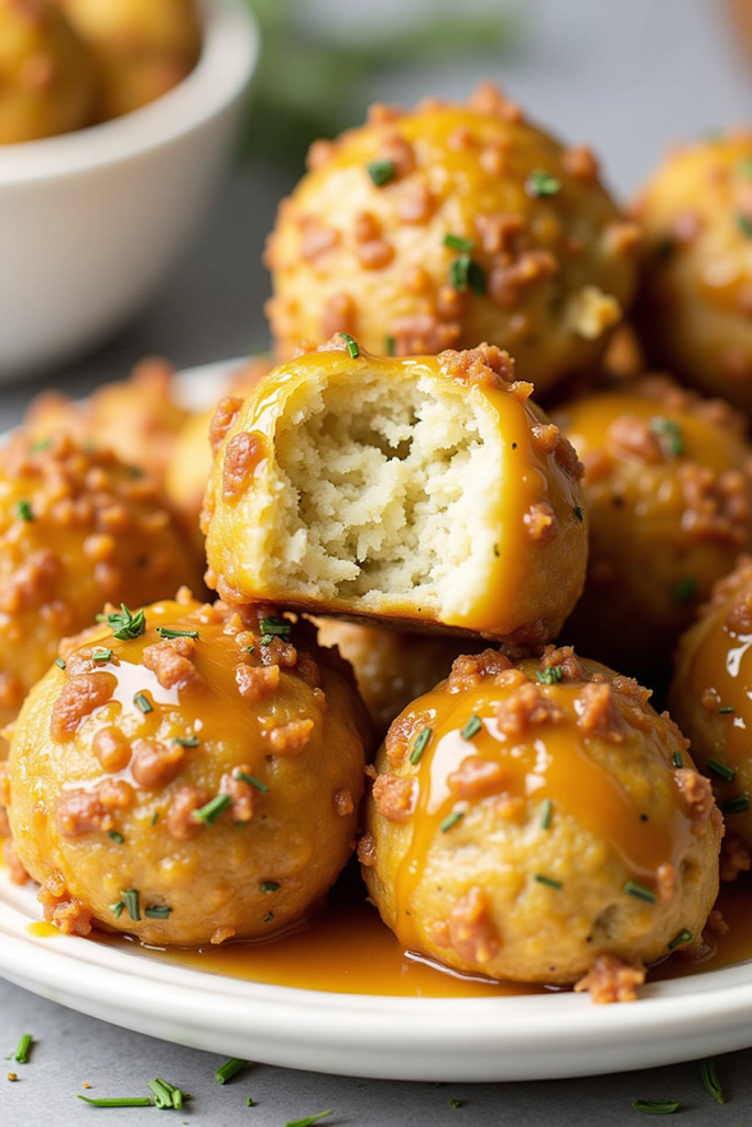 - Bake for 25–28 minutes, or until balls are golden brown and crisp on the outside. Serve warm with gravy or favorite dipping sauce.